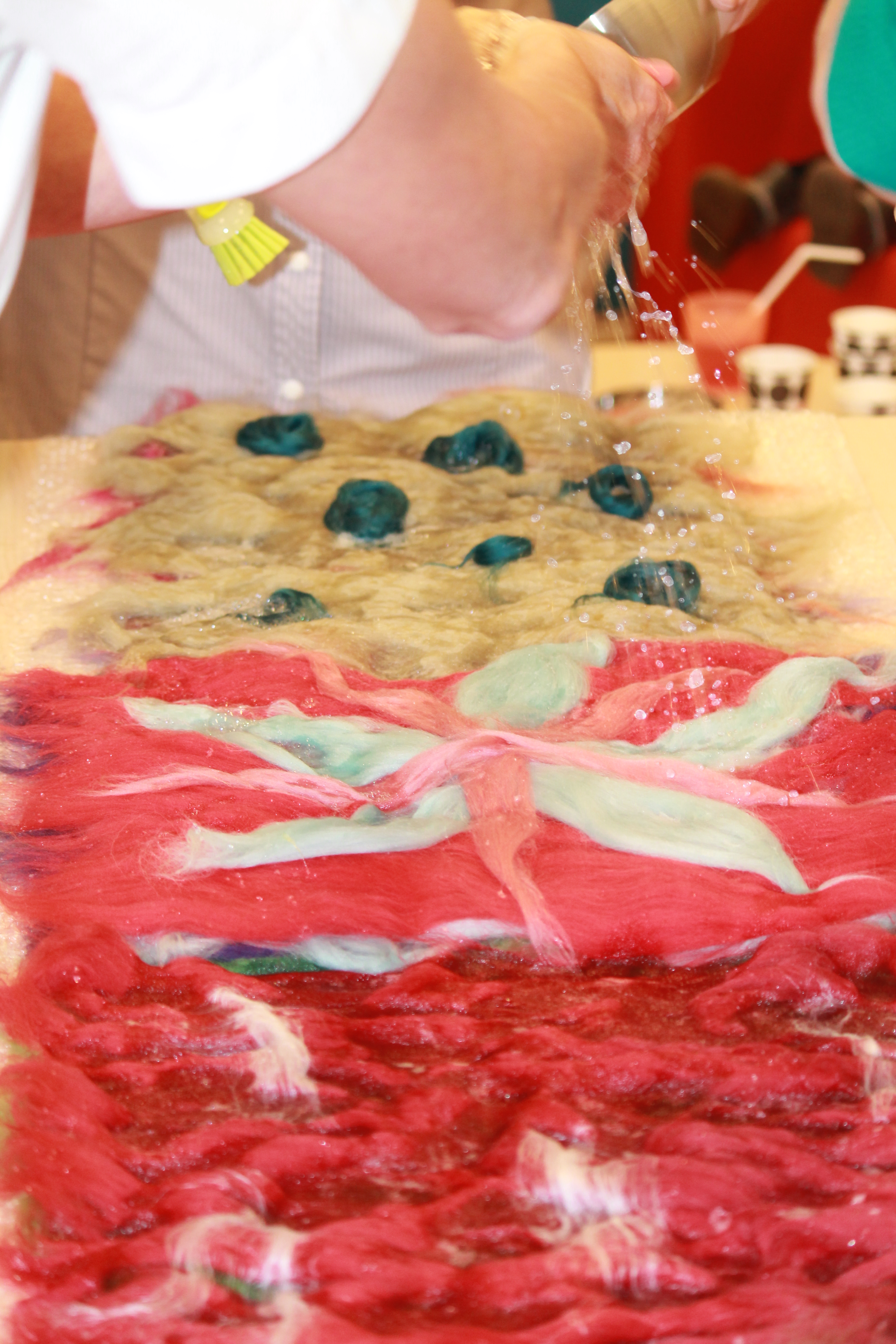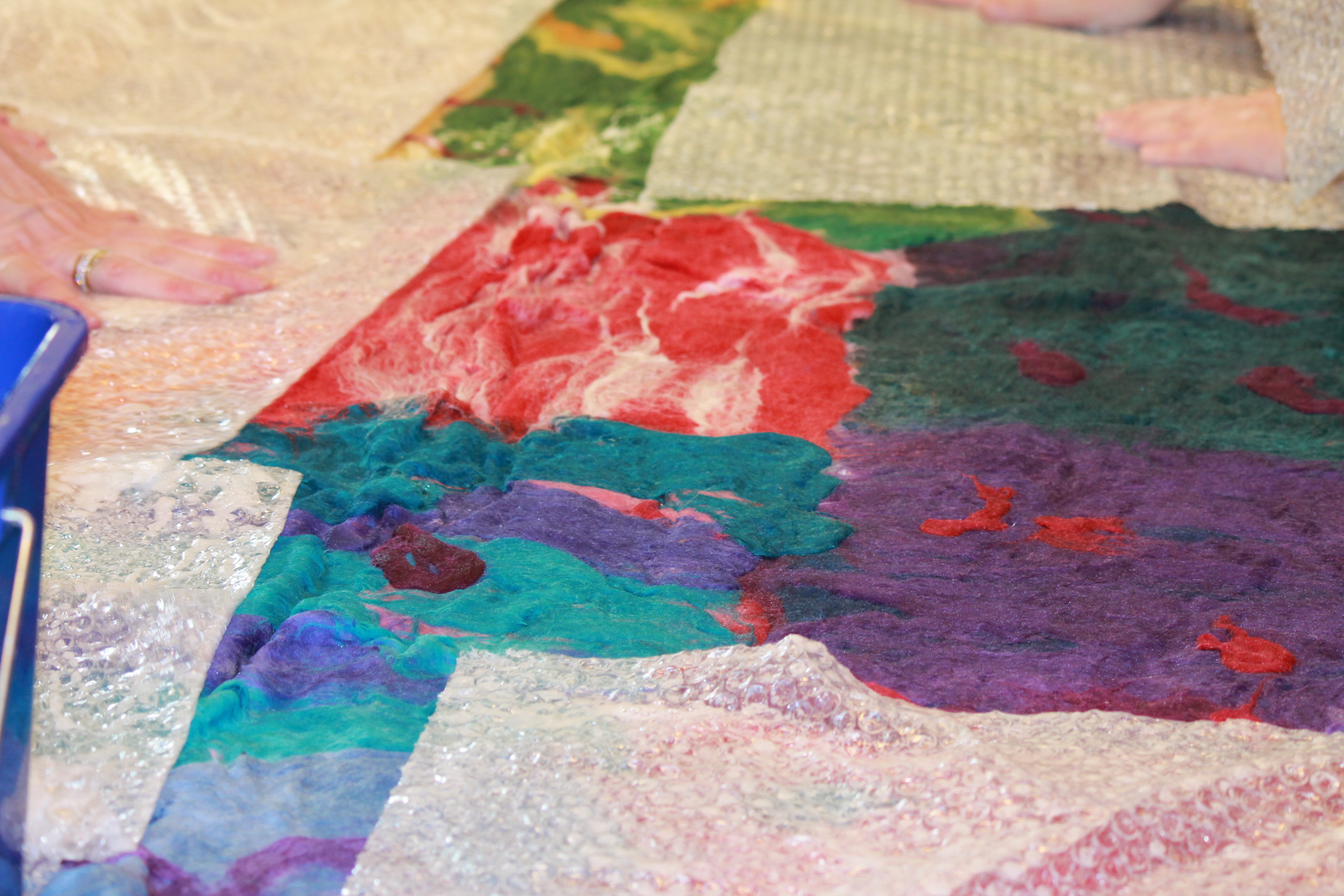 De wol wordt in plukjes neergelegd. Eerst werkte ieder aan zijn eigen lapje, maar al snel werd besloten alles aan elkaar vast te maken en met elkaar te verbinden.